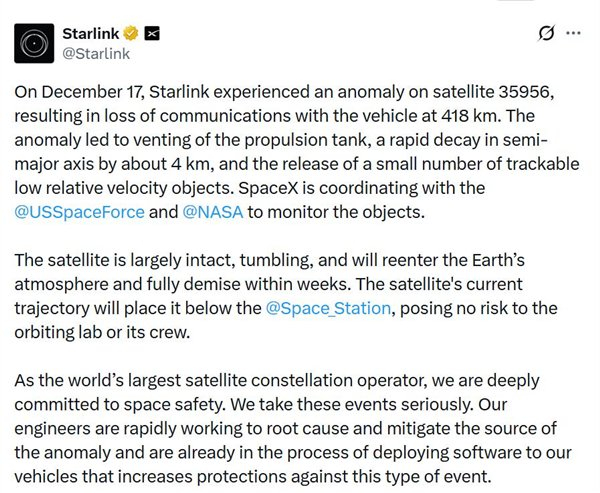 12月20日消息,据媒体报道,美国太空探索技术公司(SpaceX)旗下“星链”计划表示,其一颗卫星17日在太空发生异常,产生了“少量”碎片,并在418公里的高度与地面失去通信联系,这是这家卫星互联网巨头在轨道上发生的罕见动力事故。