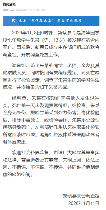 新京报讯 1月11日,河南新蔡县联合调查组发布情况通报,2026年1月8日6时许,新蔡县今是清华园学校七年级学生朱某(男,13岁)被发现在宿舍内死亡。事发后,新蔡县成立由多部门组成的联合调查组,开展调查处置工作。