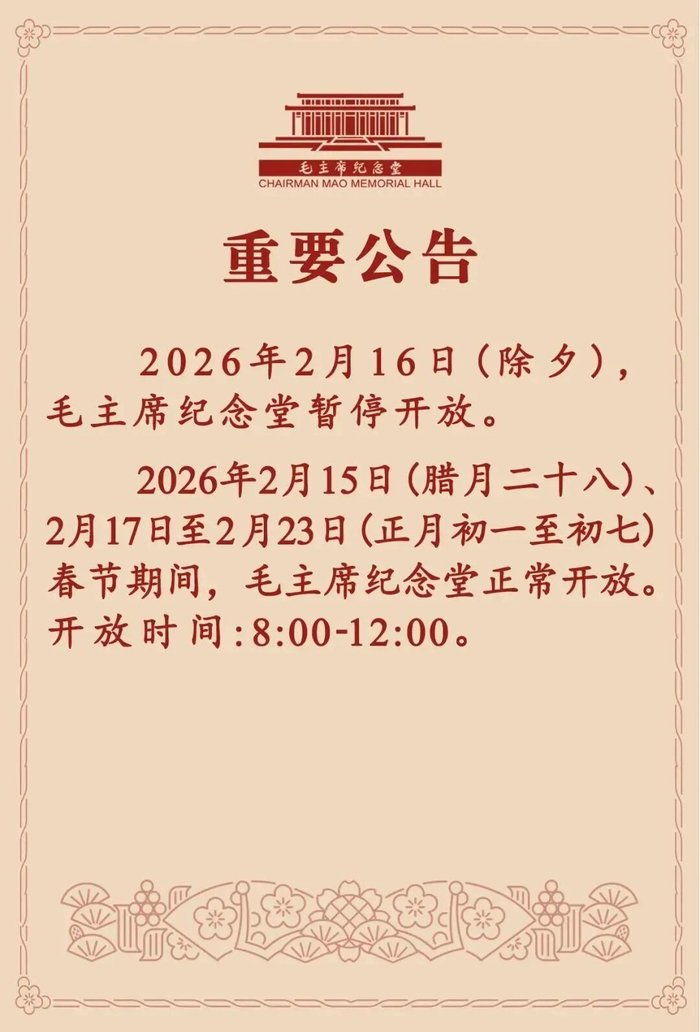 2月10日,毛主席纪念堂官方公众号发布重要公告:2026年2月16日(除夕),毛主席纪念堂暂停开放。