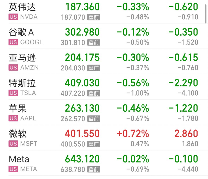 大型科技股多数下跌,英伟达、谷歌、亚马逊、特斯拉、苹果、Meta微跌,微软上涨0.72%。