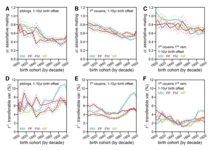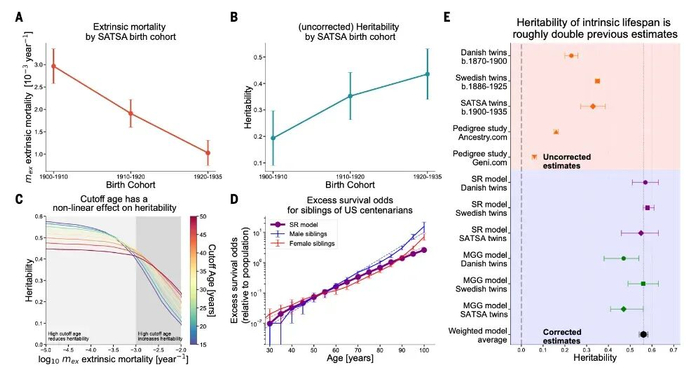 研究发现,随着疫苗和卫生条件的普及,当时的“外源性死亡率”显著下降了 3 倍之多。而正如模型所预测的那样,随着这些随机干扰消失,原本被掩盖的寿命遗传率便随之“水涨船高”,自然上升了约 2 倍。