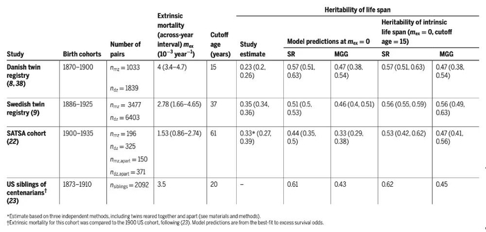 [1]Shenhar, B., Pridham, G., De Oliveira, T. L., Raz, N., Yang, Y., Deelen, J., Hägg, S., & Alon, U. (2026). Heritability of intrinsic human life span is about 50% when confounding factors are addressed. Science, 391(6784), 504–510. https://doi.org/10.1126/science.adz1187