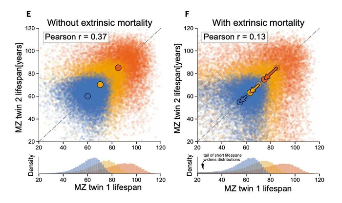 在剔除意外因素的理想状态下(图 E),同卵双胞胎寿命相关性高达 0.37;而一旦加入历史水平的意外噪音(图 F),相关性便因随机早逝形成的“数据长尾”干扰而骤降至 0.13。| 参考文献[1]