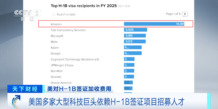 亚马逊、谷歌、特斯拉、微软和Meta等科技巨头,一直依赖H-1B签证项目来雇用包括软件开发工程师在内的外国员工。据CNBC报道,在2025财年前三个季度,也就是截至今年6月30日,仅亚马逊一家公司获批的H-1B签证就超过14000个,微软和Meta也各有超过5000个获批。