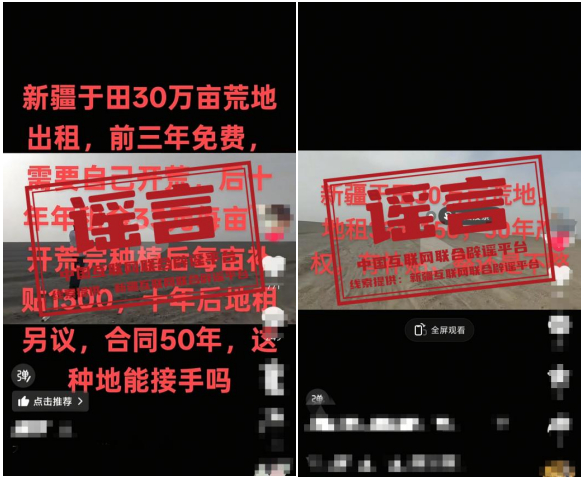 真相:近日,有网民在网络上发布信息称“新疆于田30万亩荒地出租,前三年免费,需要自己开荒,开荒完种植后每亩补贴1300元,合同50年”,引发社会关注。经新疆于田县自然资源局核实,网传信息系谣言。目前于田县自然资源局未曾与任何企业或个人签订30万亩土地承包合同,也未曾发布过任何相关信息。(来源:“新疆网络辟谣”微信公众号、和田网络举报辟谣)