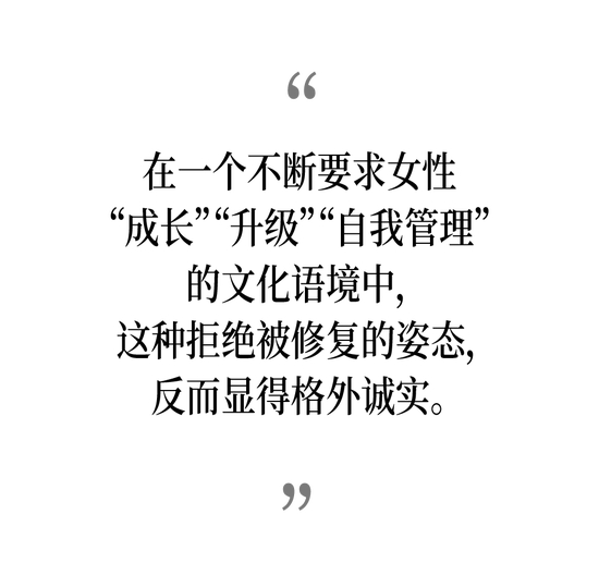 这是一种非常反叙事的成长方式。她依然会犯错,依然会感到羞愧,依然无法彻底摆脱自我厌弃,但她开始承认失去、承认悲伤,也承认自己并非永远需要被观看、被解释。最终那个不再看向镜头的背影,并不是“治愈”的象征,而是她终于愿意独自面对现实世界的证明。