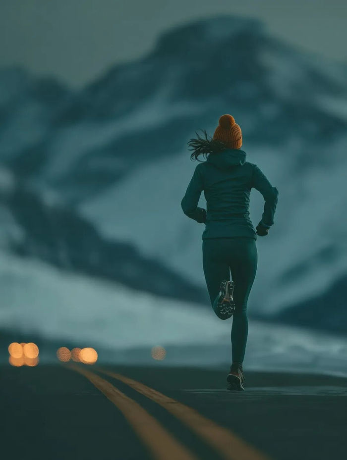 Prompt: A female runner on a highway in the snowy mountains --sref 3337845691 --ar 3:4 --sw 100 --s 300 --exp 30 --V 7