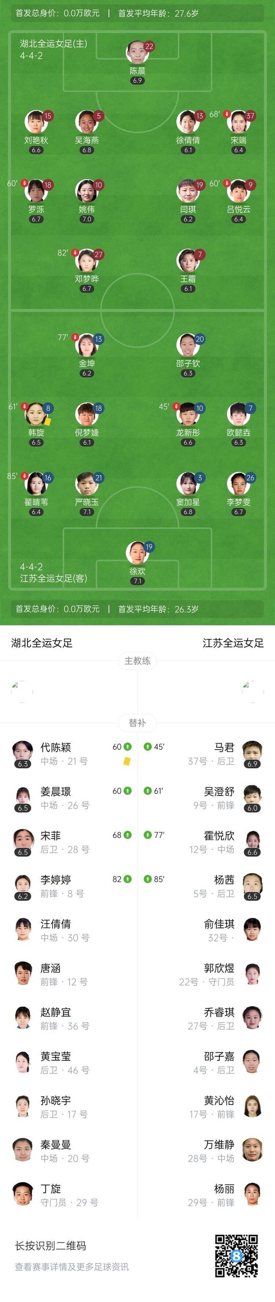直播吧11月15日讯 北京时间11月15日晚上19:45,全运会女足决赛在佛山世纪莲体育中心体育场进行,湖北女足对阵江苏女足。上半场,双方均无建树。下半场,霍悦欣替补登场第90分钟绝杀。全场结束,湖北0-1江苏。
