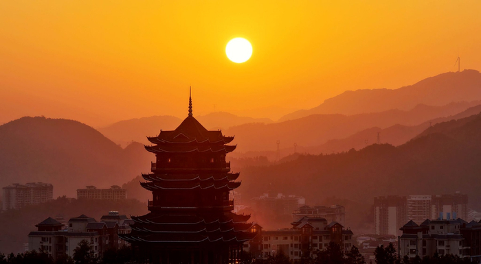 在柳州市三江侗族自治县,浔江楼与远山共沐霞光,绘就一幅侗乡冬日诗意画卷,美不胜收。(柳州市三江侗族自治县纪委监委供 龚普康/摄)