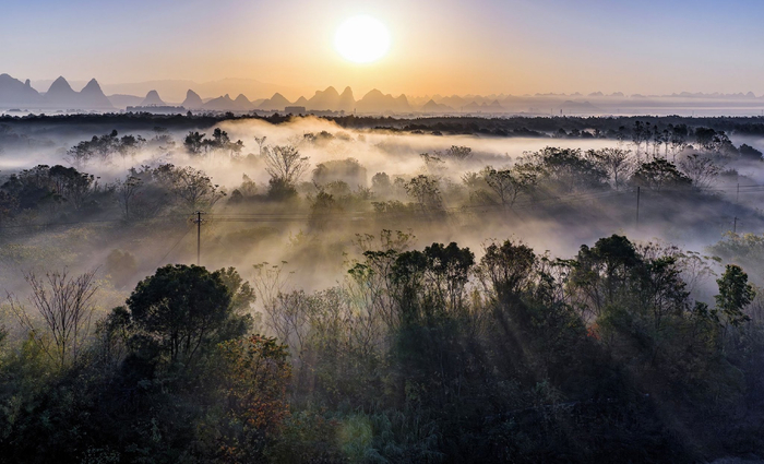 桂林市象山区二塘乡的清晨,寒雾被朝阳温柔撕开,金辉如暖手轻抚大地,朦胧中透出融融暖意,似一声低语唤醒了沉睡的冬野。(阳朔县纪委监委供 陈彦/摄)