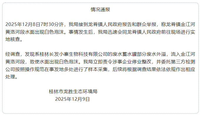 经调查,发现系桂林长发小寨生物科技有限公司的废水蓄水罐部分废水外溢,流入金江河黄洛河段,致使水面出现白色泡沫。龙胜生态环境局立即责令涉事企业停业整改,并委托第三方检测公司按照操作规范在事发地多处进行了样本采集,后续将根据调查结果依法依规作出相应处理。