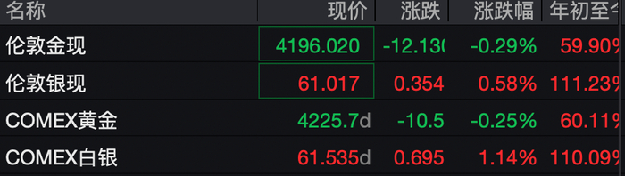 继12月9日白银价格首次突破每盎司60美元/盎司大关后,12月10日,白银价格延续涨势,COMEX白银最高站上62美元/盎司。截至发稿,COMEX白银报61.535美元/盎司,涨1.14%,年内涨幅超110%;伦敦银现价格也突破61美元/盎司关口,报61.017美元/盎司,年内涨幅超111%,远高于伦敦金现同期涨幅。
