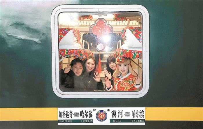 12月22日,K7041次旅客列车从哈尔滨站驶出,开往漠河。这是中国铁路哈尔滨局集团有限公司今冬开行的首趟东北民俗文化主题列车。充满乡土气息的主题车厢、地方特色的饮品小食……一系列元素让旅客深刻感受到东北地域文化的“热闹劲儿”。