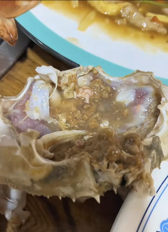 关键的是螃蟹根本不能吃,“已经变质了,蒸出来淌黑汤,有臭味,肉质发面。我们找他退,他完全不理,不给任何处理。”