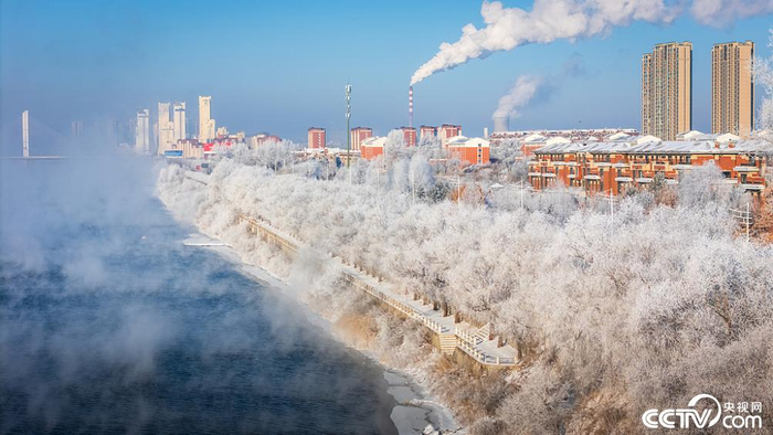 雪后的吉林市阿什哈达一带形成了壮观唯美的雾凇,宛如梨花盛开。