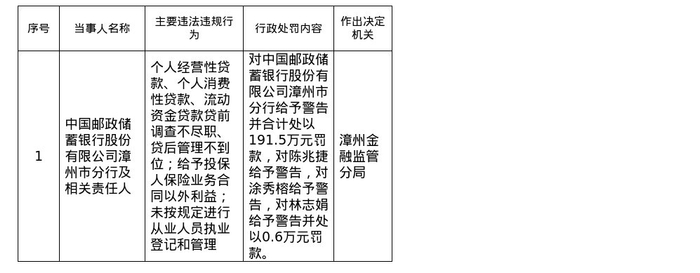 针对上述违法违规行为,漳州金融监管分局对邮储银行漳州市分行给予警告并合计处以191.5万元罚款;对陈兆捷给予警告;对涂秀榕给予警告;对林志娟给予警告并处以0.6万元罚款。