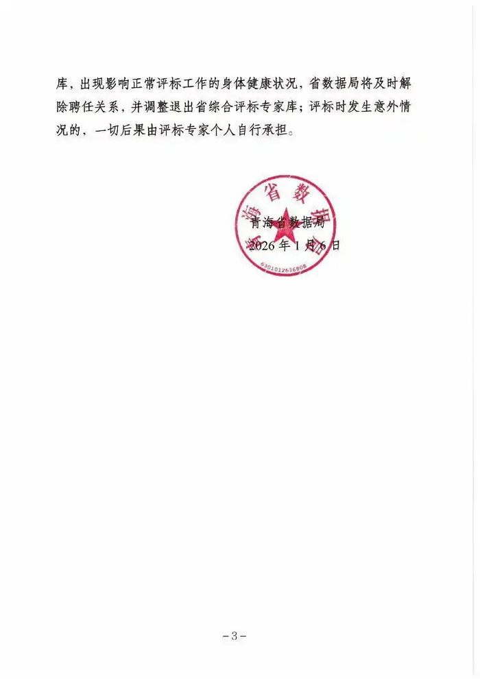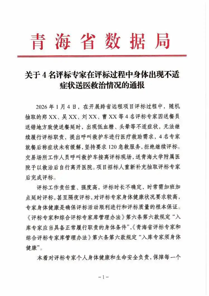 近日,青海省数据局在青海省公共资源交易网发布《关于4名评标专家在评标过程中身体出现不适症状送医救治情况的通报》。