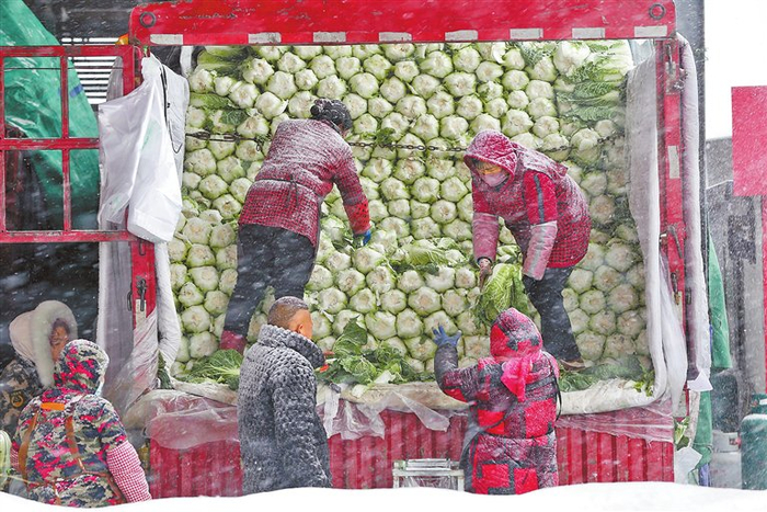 1月19日,在河南万邦国际农产品物流城,工作人员在搬运蔬菜。面对恶劣天气,市场确保货源充足、种类齐全,有效保障降雪期间城乡居民的“菜篮子”需求。 记者 王铮 摄
