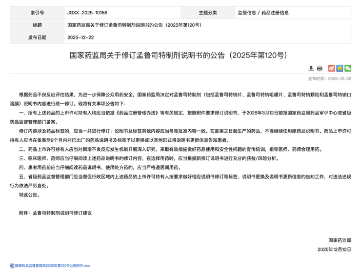 2025年12月22日,国家药监局发布公告,要求在孟鲁司特制剂说明书中统一增加警示语,提示在各年龄段患者中均报告了神经精神不良反应。 图源:国家药监局官网