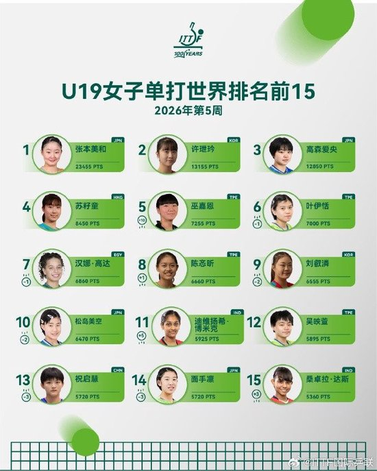 WTT常规挑战赛马斯喀特站女单冠军石洵瑶排名上升2个名次位列第13;亚军何卓佳排名上升8个名次位列第27;四强纵歌曼排名上升16个名次位列第44;八强安娜·赫尔希排名上升5个名次位列第43,刷新个人职业生涯排名新高。