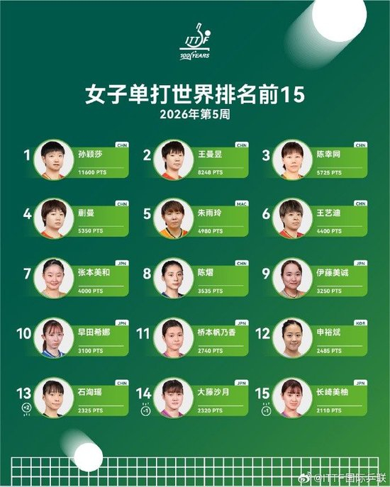 国际乒联2026年第5周世界排名:王楚钦男单第一,孙颖莎女单第一