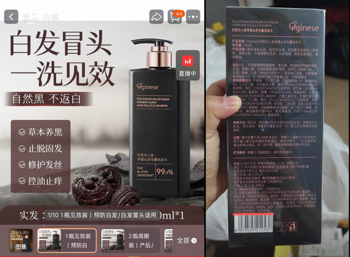 少白头、熬夜白发、压力白发……随着白发人群年轻化,“白发变黑”成为商家眼中的商机。“白发根养黑、自然变黑、告别染发剂”,在购物平台上,大量宣称“可把白发洗黑”的非染发剂类洗发水产品,配上所谓的真人实测数据,收割着白发人群焦虑。