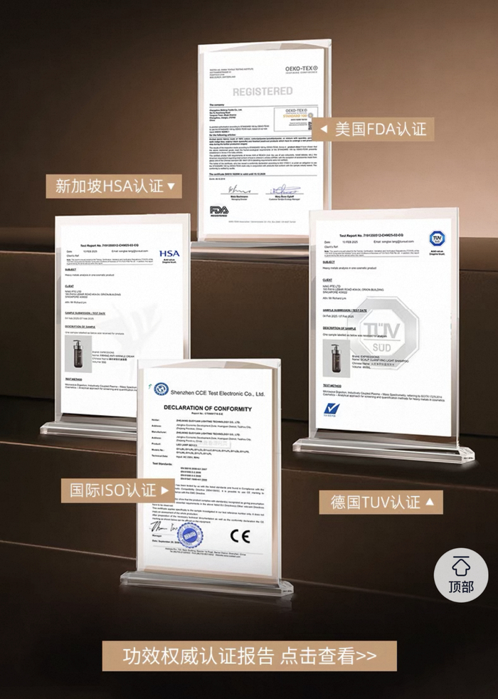 部分洗发水在宣传“白发洗黑”功效时,声称有相关功效认证或检测报告。EXPRESSIONS爱碧生海外旗舰店宣称,EXPRESSIONS毛囊焕活乌发洗发水“白发不用染,黑发洗出来”,并声称该产品获得了新加坡/美国/欧盟专业认证,但所有列出的认证都不清晰,下方的“功效权威认证报告 点击查看”也无法点击。产品图文宣传还用小字显示,数据来源于EXPRESSIONS内部实验室:在一项开放的功效检测研究中,298名女性(18-50岁)参加实验,在使用一次后,黑发增加90%,实际效果因人而异。邓勇认为,该宣传表述违背头发色素生成的生理规律,属于明显的夸大宣传。