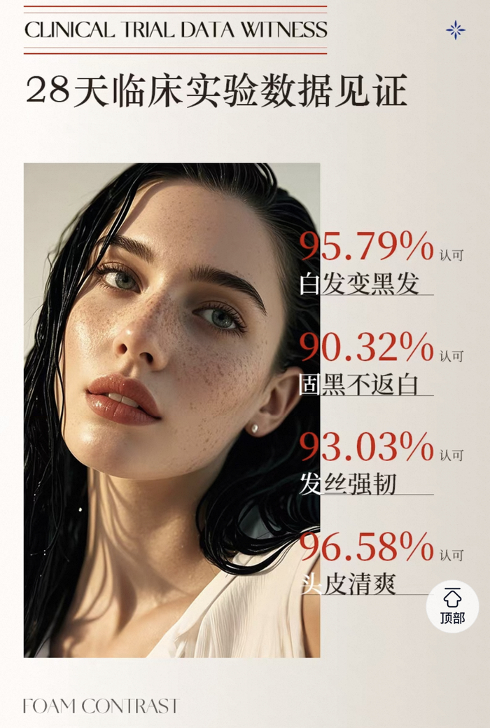 一些“白发洗黑”洗发水的宣传中会提到临床试验数据,让不少消费者更加相信其功效。如VENUAN何首乌洗发水宣称,“有院线级35年白转黑配方,28天临床实验数据见证,95.79%认可白发变黑发,90.32%认可固黑不返白,一瓶搞定白断油,真人实测2周白发减少94.32%。”记者咨询VENUAN海外旗舰店该数据的真实性,客服表示,都是品牌方找到真实用户体验后反馈的数据。