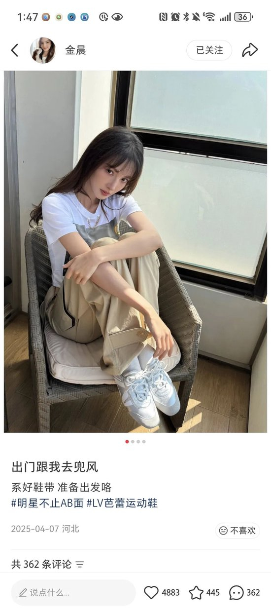 记者发现,2025年4月7日,金晨曾在小红书发布:“出门跟我去兜风”。