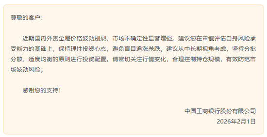 2月1日,工商银行发布消息称,近期国内外贵金属价格波动剧烈,市场不确定性显著增强。建议投资者在审慎评估自身风险承受能力的基础上,保持理性投资心态,避免盲目追涨杀跌。建议从中长期视角考虑,坚持分批分散、适度均衡的原则进行投资配置。请投资者密切关注行情变化,合理控制持仓规模,有效防范市场波动风险。