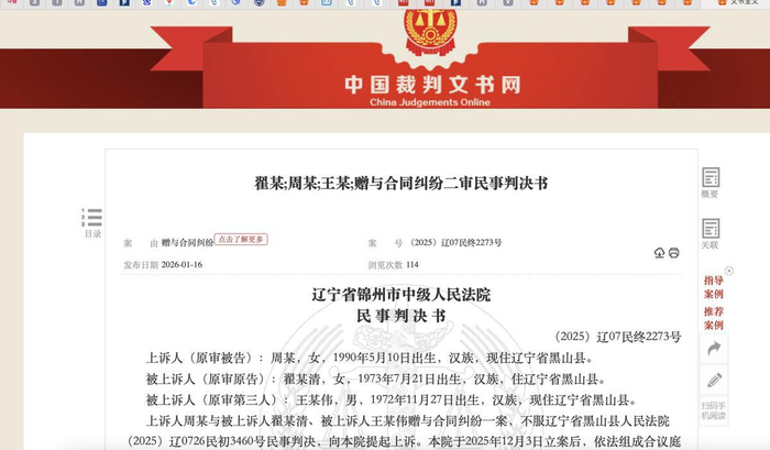 然而,没过几天,王某伟的妻子翟某清便通过电话找到了周某。此时周某才得知,王某伟并未离婚,两人仅是分居。随后,妻子翟某清将周某起诉至辽宁省黑山县人民法院,称购买金镯子用的是夫妻共同财产,要求其返还款项。