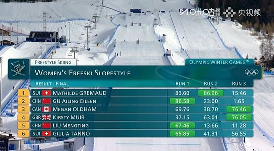 最终成绩,瑞士选手凭借第二滑以领先谷爱凌0.38分的优势夺冠。