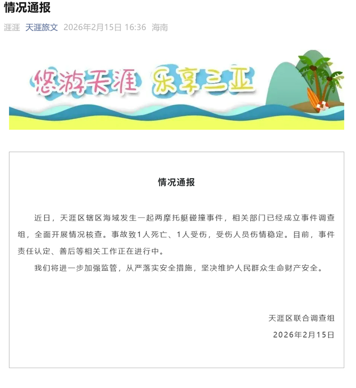 近日,天涯区辖区海域发生一起两摩托艇碰撞事件,相关部门已经成立事件调查组,全面开展情况核查。事故致1人死亡、1人受伤,受伤人员伤情稳定。目前,事件责任认定、善后等相关工作正在进行中。