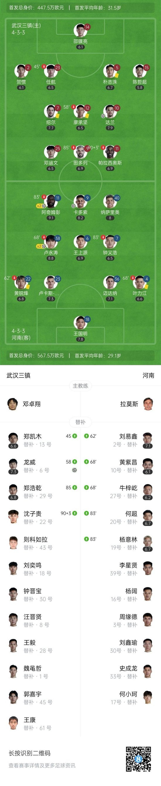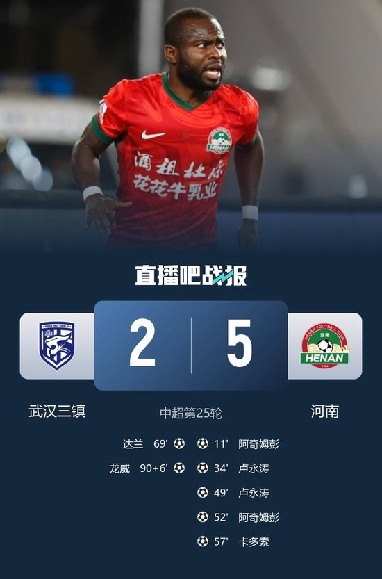 直播吧9月19日讯 北京时间9月19日19:35,中超第25轮,武汉三镇在武汉体育中心体育场迎战河南。上半场,帕拉西奥斯头球中框,阿奇姆彭破门打入赛季第12球,卢永涛再入一球;下半场,阿奇姆彭、卢永涛分别双响,卡多索锦上添花,达兰、龙威扳回两球。最终,武汉三镇2-5河南队近11轮仅1胜,近2场丢9球,积24分排名第12位,河南队取得两连胜,积29分暂居第10位。