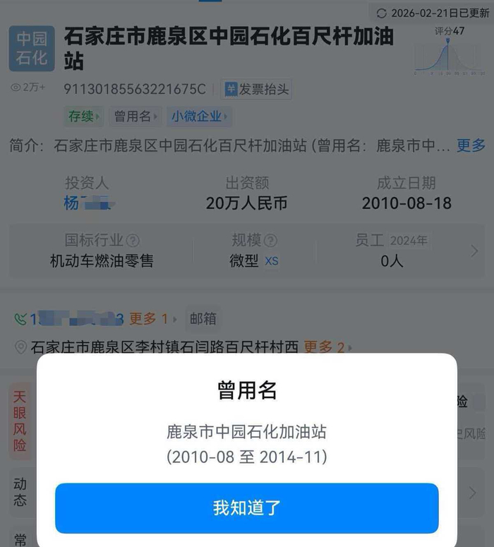 不过,记者查询天眼查显示,该加油站2010年成立时的名字为“鹿泉市中园石化加油站”,2014年已经改为了“石家庄市鹿泉区中园石化百尺杆加油站”。