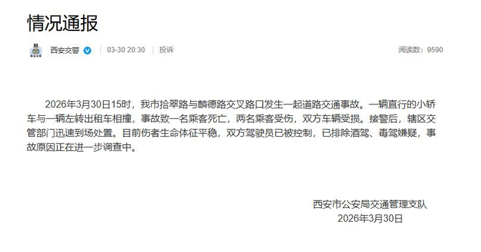 央视网消息:据西安交警官微消息,西安市公安局交通管理支队通报,3月30日15时,西安市拾翠路与麟德路交叉路口发生一起道路交通事故。一辆直行的小轿车与一辆左转出租车相撞,事故致一名乘客死亡,两名乘客受伤,双方车辆受损。接警后,辖区交管部门迅速到场处置。目前伤者生命体征平稳,双方驾驶员已被控制,已排除酒驾、毒驾嫌疑,事故原因正在进一步调查中。