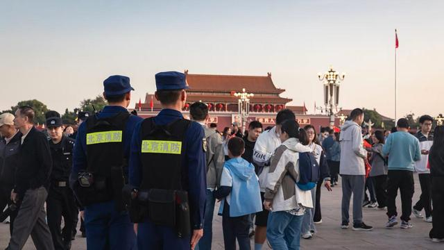 10月1日,迎着清晨第一缕阳光,五星红旗在天安门广场冉冉升起。在观看升旗仪式的观众身后,一抹醒目的“火焰蓝”停下巡逻的脚步,向着国旗行注目礼——自前一晚广场开放,保障升旗仪式的消防员们的脚步就未曾停歇,从夜晚到清晨,他们以细致入微的工作,为观礼群众提供安全守护。