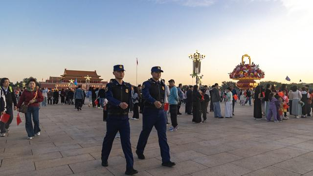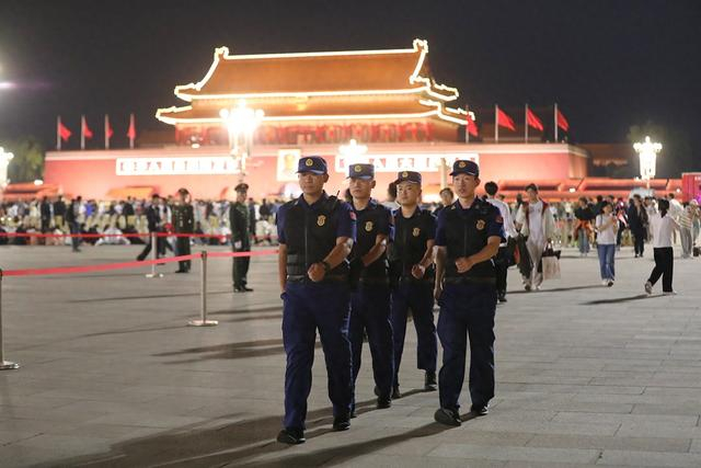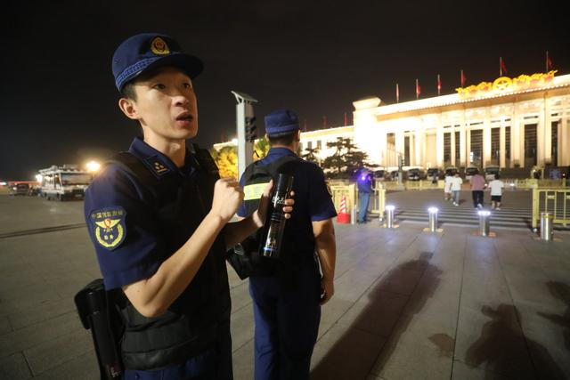 9月30日晚,天安门地区消防救援支队的消防员在广场巡逻。
