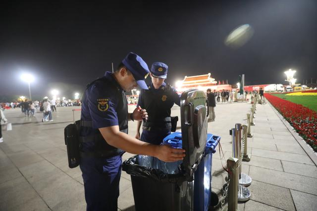 巡逻中,庞涛和队友薛永强还会时不时检查广场上的重要设施设备。在垃圾桶旁,他们打开手电仔细查看桶内杂物;在配电箱边,他们用热敏成像仪精准监测箱内温度;在武警岗亭侧,他们拿起灭火器认真观察压力表数值……