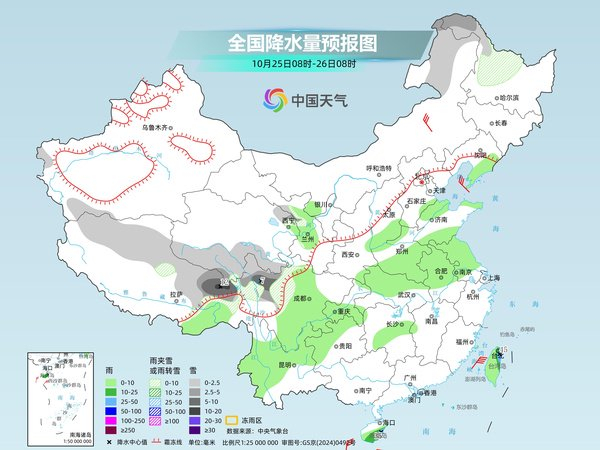 其中,今天,新疆沿天山地区西段,青海东部和南部、甘肃西南部、川西高原北部、西藏北部等地部分地区有小到中雪或雨夹雪,其中,西藏东北部、青海东南部、甘肃西南部、川西高原北部等地部分地区有大雪或暴雪;西北地区东南部、四川盆地大部、云南西部、海南岛、台湾岛等地部分地区有小到中雨,其中,海南岛东南部、台湾岛东北部等地部分地区有大雨或暴雨。