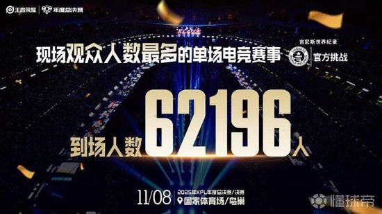 下半场开始前,鸟巢还迎来了一个电竞史上的一个里程碑时刻:本场比赛,一共有62196人来到现场观赛,这创造了一项新的吉尼斯世界纪录——2025年KPL总决赛成为现场观众人数最多的单场电竞赛事!