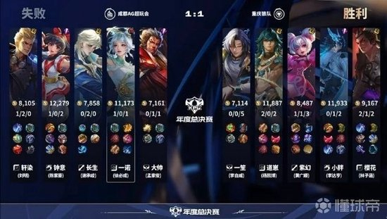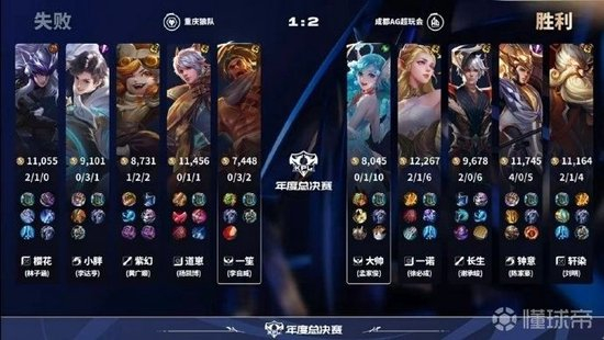 首局比赛氛围就被推上高潮,AG在开局人头比0-8/1-11、落后1万经济的巨大劣势完成超级大逆转,狼队手握巨大优势推家功亏一篑,紫幻的西施想闪现开团失误,一诺的鲁班七号伤害拉满守住还剩不到1/5血的水晶,AG最后一波奇迹团完成翻盘,1-0领先重庆狼队。甚至在比赛结束时,AG战绩都还是负的。