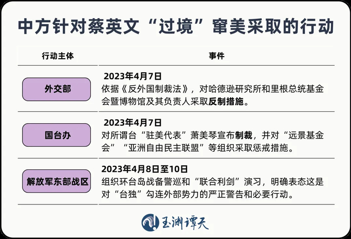 针对蔡英文“过境”窜美从事政治活动,中国外交部对哈德逊研究所和里根总统基金会暨博物馆及其负责人采取制裁措施,随后持续推进的,还有军事演习等行动。