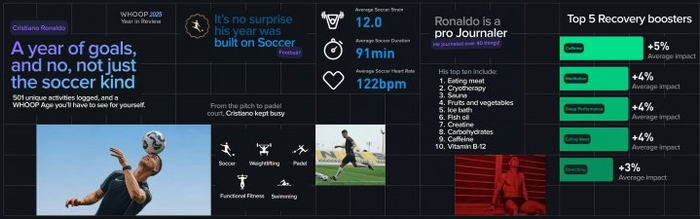 2025年,C罗记录了超过40件事项,其中前10为:吃肉、冷冻疗法、桑拿、水果和蔬菜、冰浴、鱼油、肌酸、碳水化合物、咖啡因、维生素B12。恢复促进效果前5的是咖啡因、冥想、睡眠质量、吃肉和拉伸。