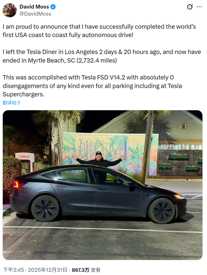 财联社1月1日讯(编辑 史正丞)在2025年的结尾,特斯拉车主大卫·摩斯(David Moss)实现了一项颇具时代特色的挑战:坐在他的Model 3里,静静地看着汽车自己从美国的西海岸开到东海岸,全程不进行任何干预。