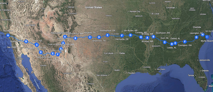 摩斯在一张地图上详细展示了贯穿全美的历程,并列出了近30个超充站的几乎全部停靠信息。