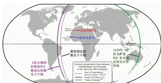 15世纪末,罗马教皇为调解西班牙、葡萄牙的海外殖民争端,划定了全球殖民势力分界线。