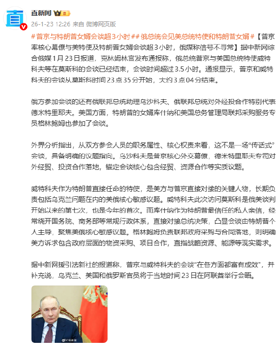 [普京率核心幕僚与美特使及特朗普女婿会谈超3小时,俄媒称信号不寻常]据中新网综合俄媒1月23日报道,克林姆林宫发布通报称,俄总统普京与美国总统特使威特科夫等在莫斯科的会谈已经结束,会谈时间超过3.5小时。通报显示,普京和威特科夫的会谈从莫斯科时间23点35分开始,大约3点04分结束。