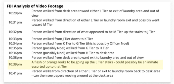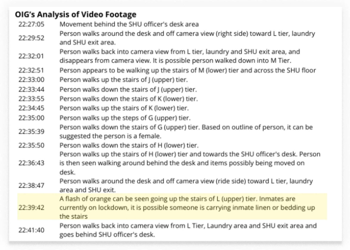 联邦调查局的观看记录将这一模糊影像描述为 “疑似一名囚犯”:“有一道橙色光影疑似正走上L监区的楼梯。这有可能是一名囚犯被押送前往该监区。”