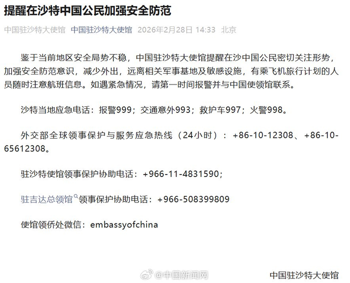 中国驻沙特大使馆提醒在沙特中国公民加强安全防范